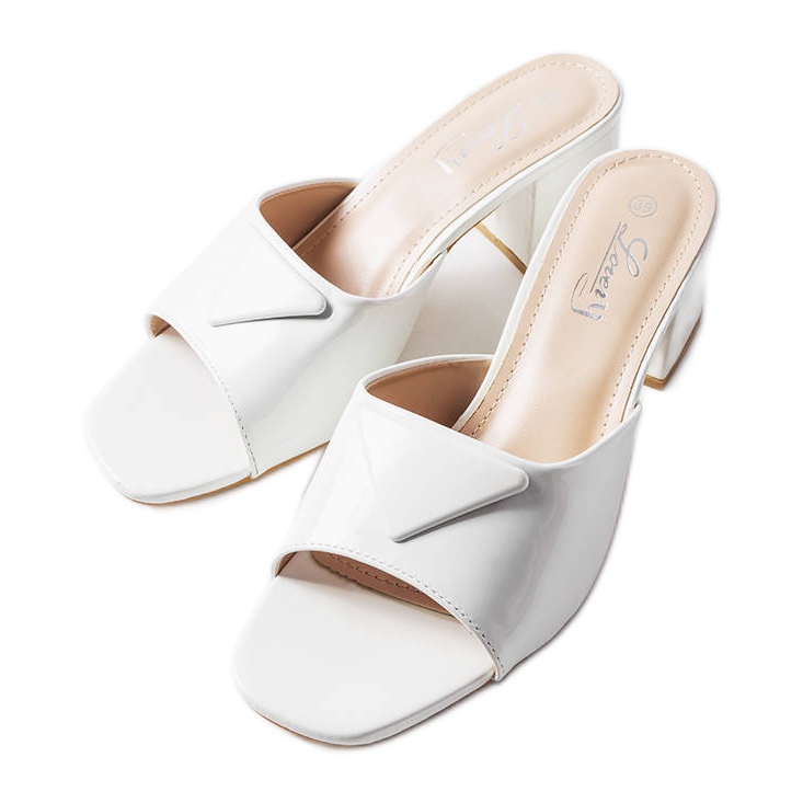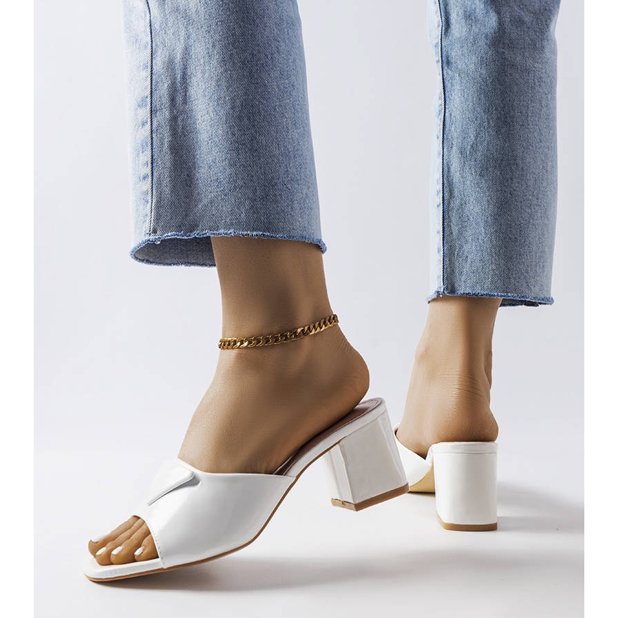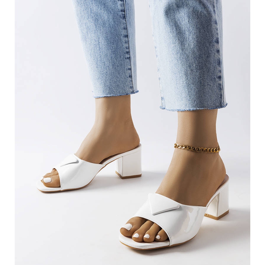 Conheça os mules brancos de salto alto Branch patenteados - um must-have para toda fashionista que busca elegância e conforto para os dias de verão. Estes elegantes chinelos são uma combinação de design moderno e funcionalidade. Confeccionados em couro ecológico, revestidos com um vistoso verniz, chamam a atenção e conferem frescor a qualquer estilo.