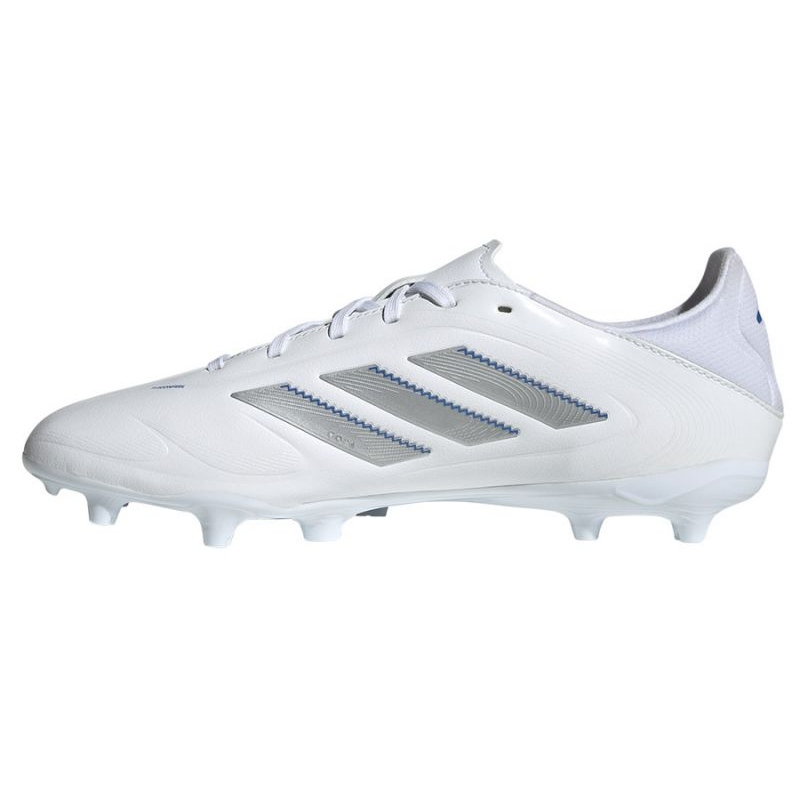 Adidas Copa Pure III League FG/MG ID9051 Sapatos em uma cor branca elegante com detalhes em prata são a escolha perfeita para todo jogador de futebol que deseja combinar estilo com desempenho em campo. Esses engarrafamentos profissionais projetados para o futebol masculino não apenas fornecem excelente estética, mas também alta funcionalidade, o que permite obter os melhores resultados em todas as condições.