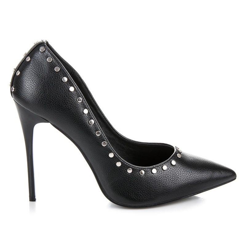 Estes estiletes caracterizam-se por um salto fino de 10 cm que acrescenta autoconfiança em qualquer ocasião. A clássica cor preta torna-os um complemento perfeito tanto para estilos elegantes de noite como para conjuntos do dia a dia. A falta de estampa permite focar no brilho sutil dos strass, que conferem ao calçado um caráter único.