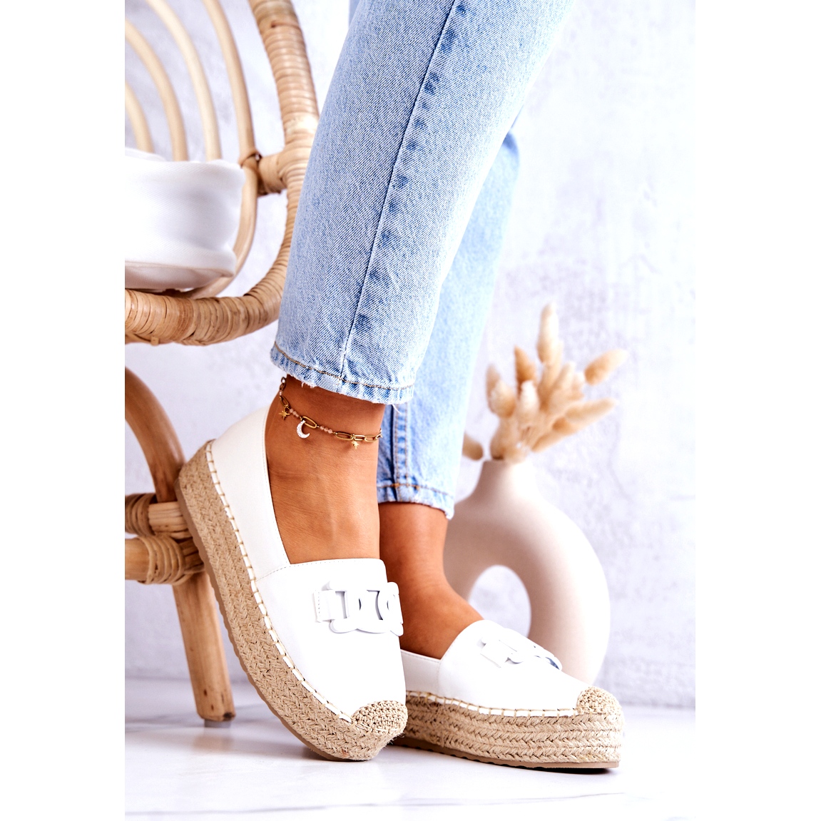 Apresentamos as clássicas alpercatas plataforma da marca FB2, que são a escolha perfeita para mulheres que valorizam elegância e conforto. Estas alpargatas brancas são confeccionadas em couro ecológico de alta qualidade, o que garante não só durabilidade, mas também um visual moderno. A sola tecida confere-lhes um carácter único e a plataforma eleva suavemente a silhueta, o que os torna extremamente atraentes.