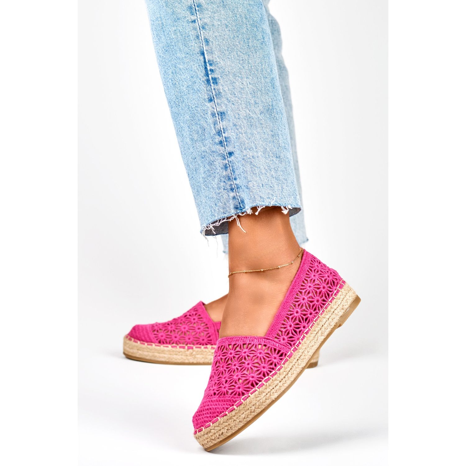 Delicadas alpargatas em rosa com rendas de rendas abertas são uma combinação de um estilo romântico com conforto morno. A parte superior feita de camurça ecológica e material têxtil fornece um ajuste agradável, e 3 cm A plataforma adiciona uma altura sutil sem deixar o conforto. Modelo escorregado, com nariz redondo e sola sintética - sapatos práticos e elegantes para estilizações cotidianas.