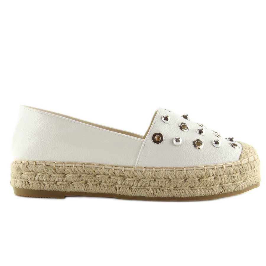 Conheça as alpercatas brancas femininas 7680 brancas - a escolha perfeita para os dias de verão! Estes sapatos exclusivos de sola alta combinam elegância e conforto, o que os torna um complemento perfeito para qualquer estilo. O cordão trançado na sola e na biqueira confere-lhes leveza e subtileza, enquanto as tachas decorativas e os anéis de prata introduzem uma nota de originalidade que chama a atenção.