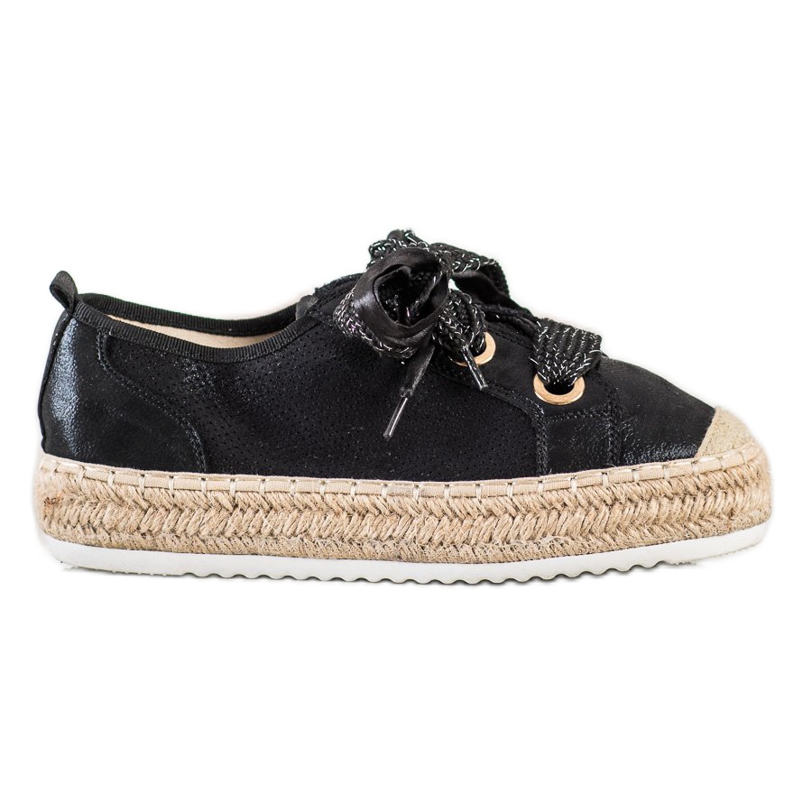 A sua cor preta universal faz com que combinem perfeitamente com calças, saias desportivas e vestidos. Feitos de couro ecológico, esses sapatos não são apenas elegantes, mas também ecológicos. Graças à inserção em tecido, as alpargatas são confortáveis de usar e o salto macio integrado garante estabilidade durante o uso.