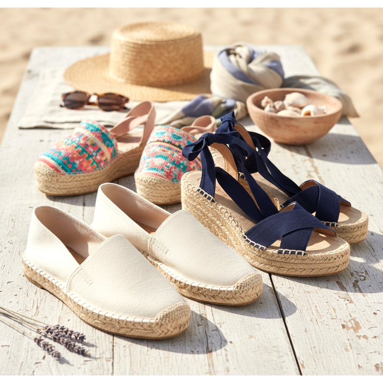 As alpercatas são extremamente versáteis. Os modelos flat são perfeitos para a praia, um passeio no calçadão à beira-mar e passeios do dia a dia. Use-os com calças de linho, calções de ganga e vestidos largos. As alpercatas brancas ou bege criam uma dupla harmoniosa com cores pastéis e estilo náutico.