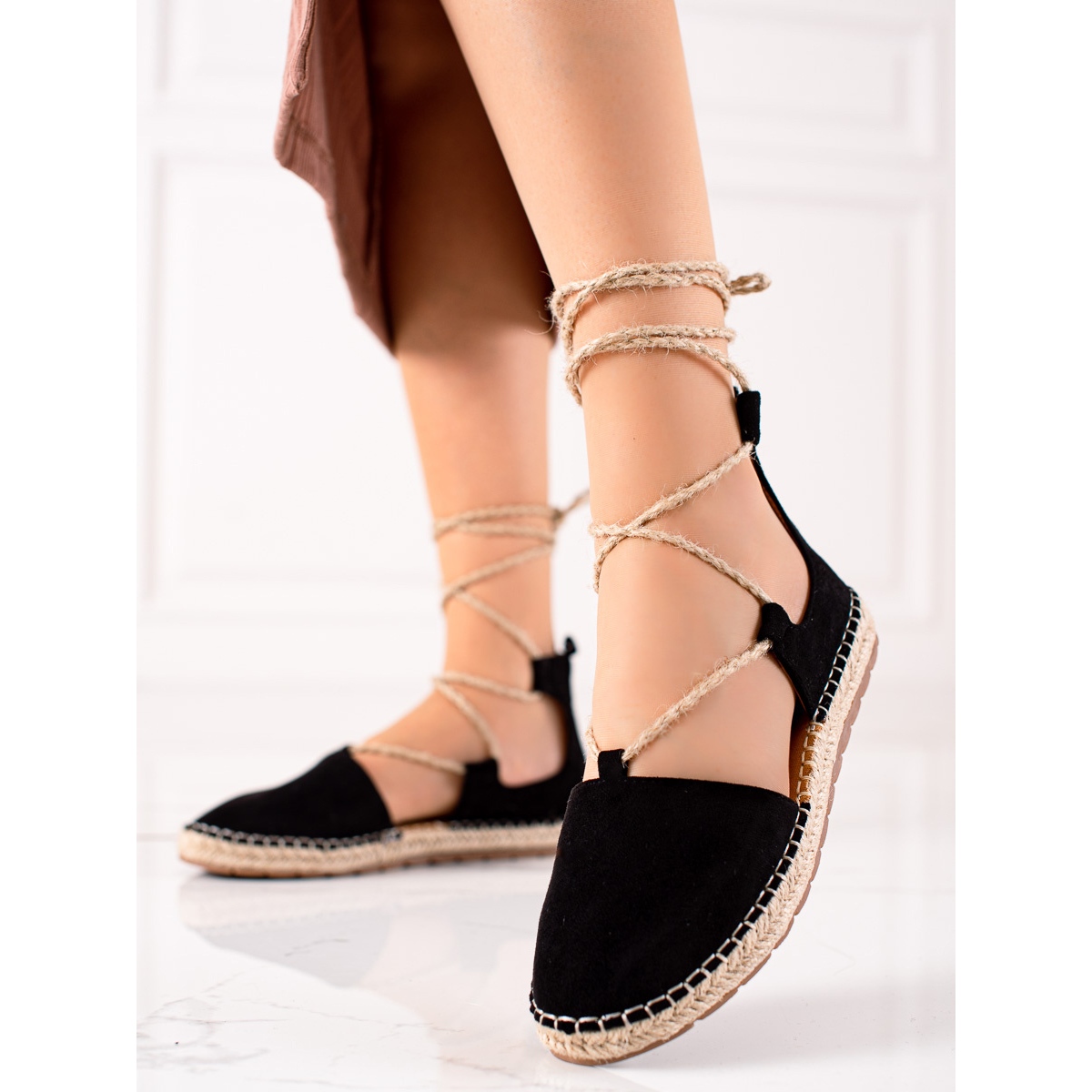 Confeccionadas com materiais de alta qualidade, as alpargatas se caracterizam por um salto macio e embutido que garante conforto de uso. A parte superior do calçado é confeccionada em couro camurça ecológico, o que confere elegância, enquanto o interior 100% têxtil garante que seus pés ficarão bem ventilados mesmo nos dias mais quentes. A sola de plástico com banda de rodagem garante aderência e estabilidade adequadas, e a ponta redonda enfatiza perfeitamente o caráter sutil dessas alpargatas.