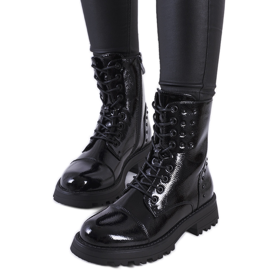 Polperro Trappers elegante e envernizado é uma proposta para mulheres que procuram uma combinação de aparência elegante com o conforto de uso. Feito de couro ecológico de alta qualidade, com um forro macio e quente, eles funcionarão especialmente no outono/inverno. Um nariz redondo e arrumado e um salto plano com uma altura de 4 cm de estabilidade e conforto de uso.