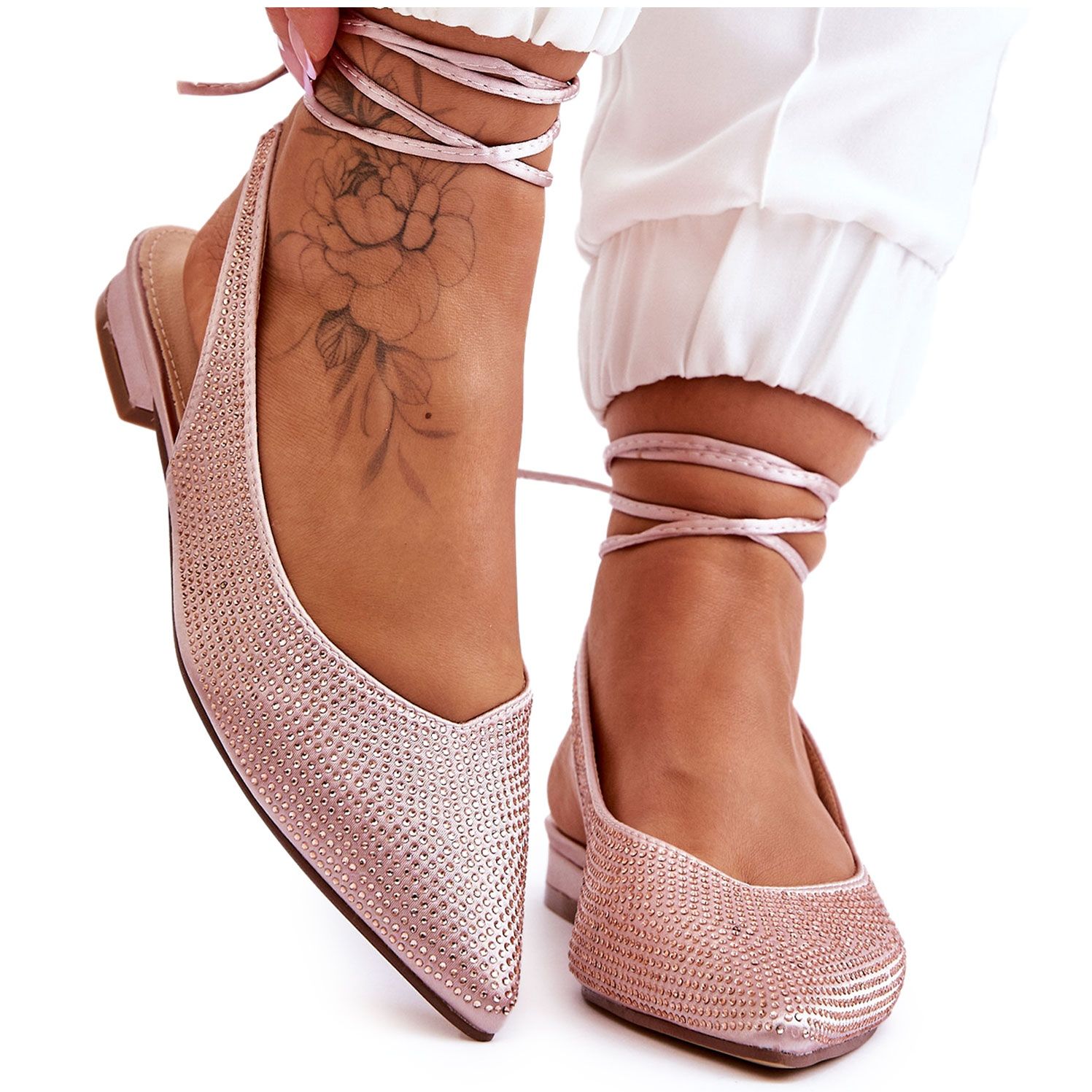 Ballerinas elegantes com salto aberto e dedo apontado de tecido de alta qualidade. A parte superior é decorada com strass brilhantes (zircões), que adicionam um sotaque leve e elegante. A inserção de couro ecológica suave garante o conforto do uso e um salto plano com uma altura de 2 cm significa que o modelo é ótimo para todos os dias em dias mais quentes. As bailarinas combinam a conveniência de escorregar com a possibilidade de ligação ajustável ao redor da panturrilha.