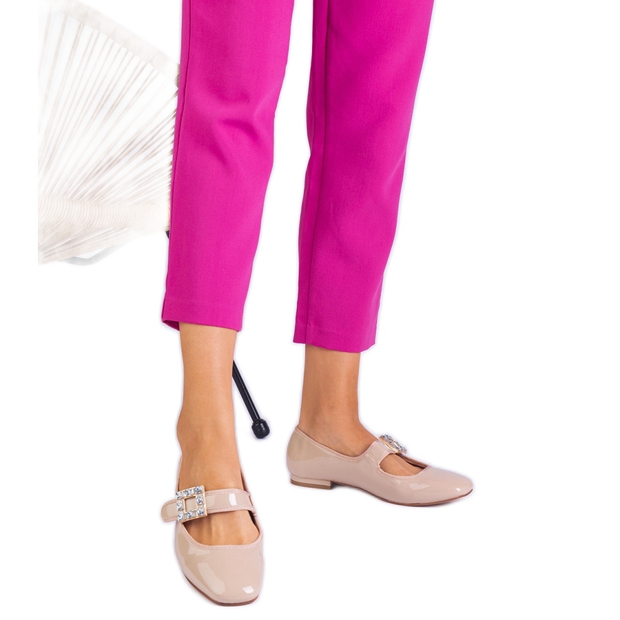 Apresentamos bailarinas bege envernizadas decoradas com uma fivela que combina elegância com conforto no uso diário. Essas bailarinas únicas são uma proposta perfeita para mulheres que procuram calçados da moda, que funcionarão tanto em formal quanto todos os dias.