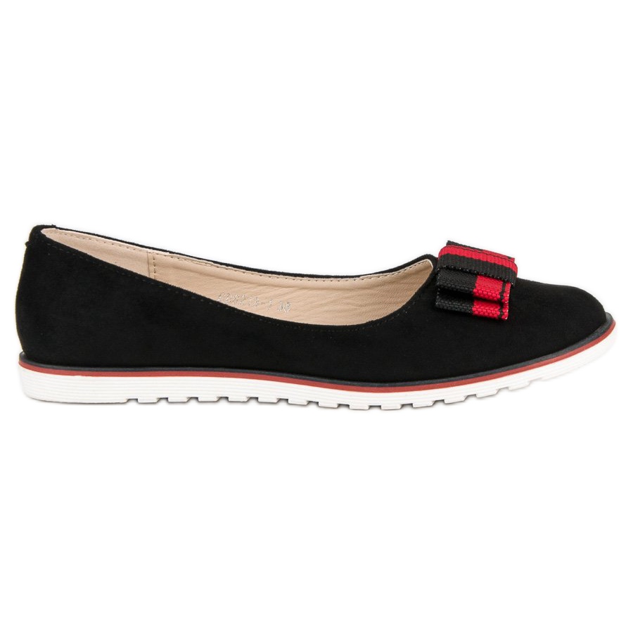 As sapatilhas têm uma cor preta universal que combina com quase todos os estilos. Graças ao laço decorativo em vermelho e preto com um toque de rosa, estes sapatos ganham feminilidade e originalidade. Biqueiras redondas e salto macio integrado proporcionam conforto de uso excepcional, tornando-os a escolha perfeita para longos dias em movimento.