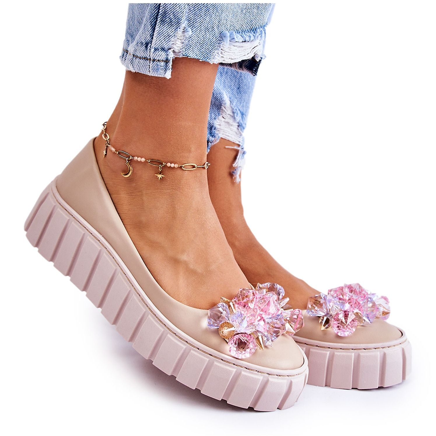 PA2 PA2 Bailarinas de couro em uma plataforma com decoração de ladette de cor bege