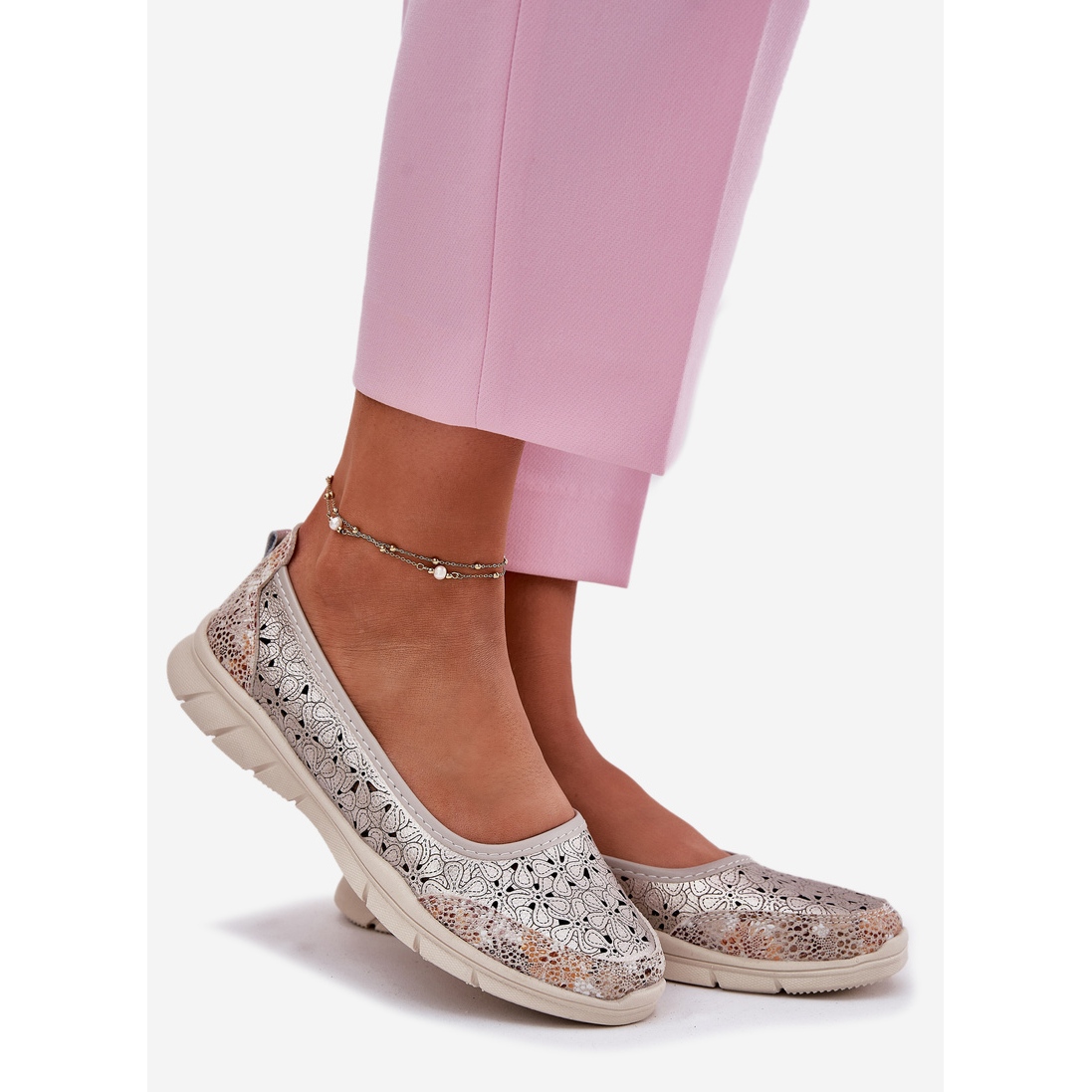 Descubra a elegância e o conforto a qualquer momento, graças às bailarinas de eventos femininas. Feitos de couro natural, essas bailarinas douradas são distinguidas não apenas pelo design clássico, mas também um padrão moderno de trabalho aberto que lhes dá leveza e originalidade.