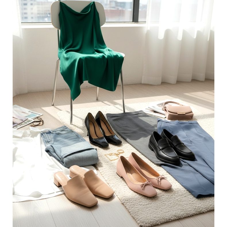 Para o escritório - use sapatilhas de bailarina ou mocassins de bico quadrado com saia lápis ou calça cigarro. Este conjunto é a quintessência do power log profissional de 2026. Escolha uma cor de sapato semelhante à barra do seu traje para alongar opticamente as pernas.
