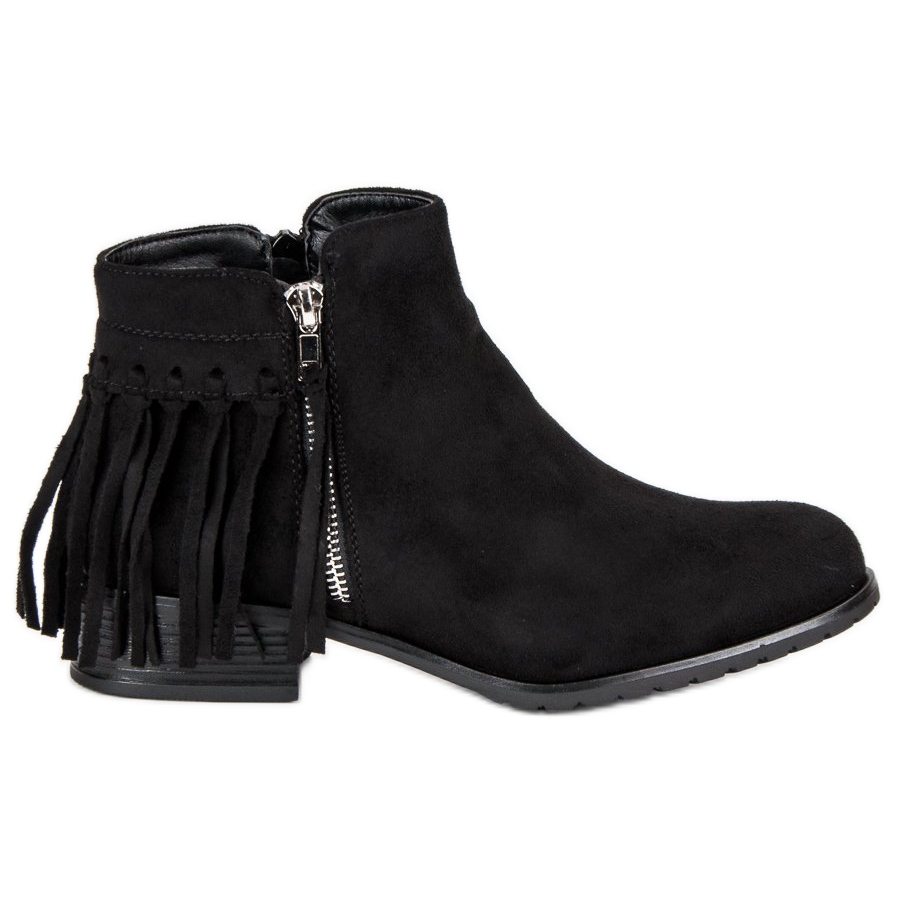 Os botins Kayla no estilo boho são a escolha perfeita para mulheres que querem aliar moda com conforto. Estas botas de camurça preta distinguem-se não só pela sua aparência elegante, mas também pelo acabamento cuidadoso em camurça ecológica de alta qualidade. A frente clássica com bico redondo e detalhes decorativos, como zíper prateado e longas franjas nas costas, conferem-lhes um caráter único.