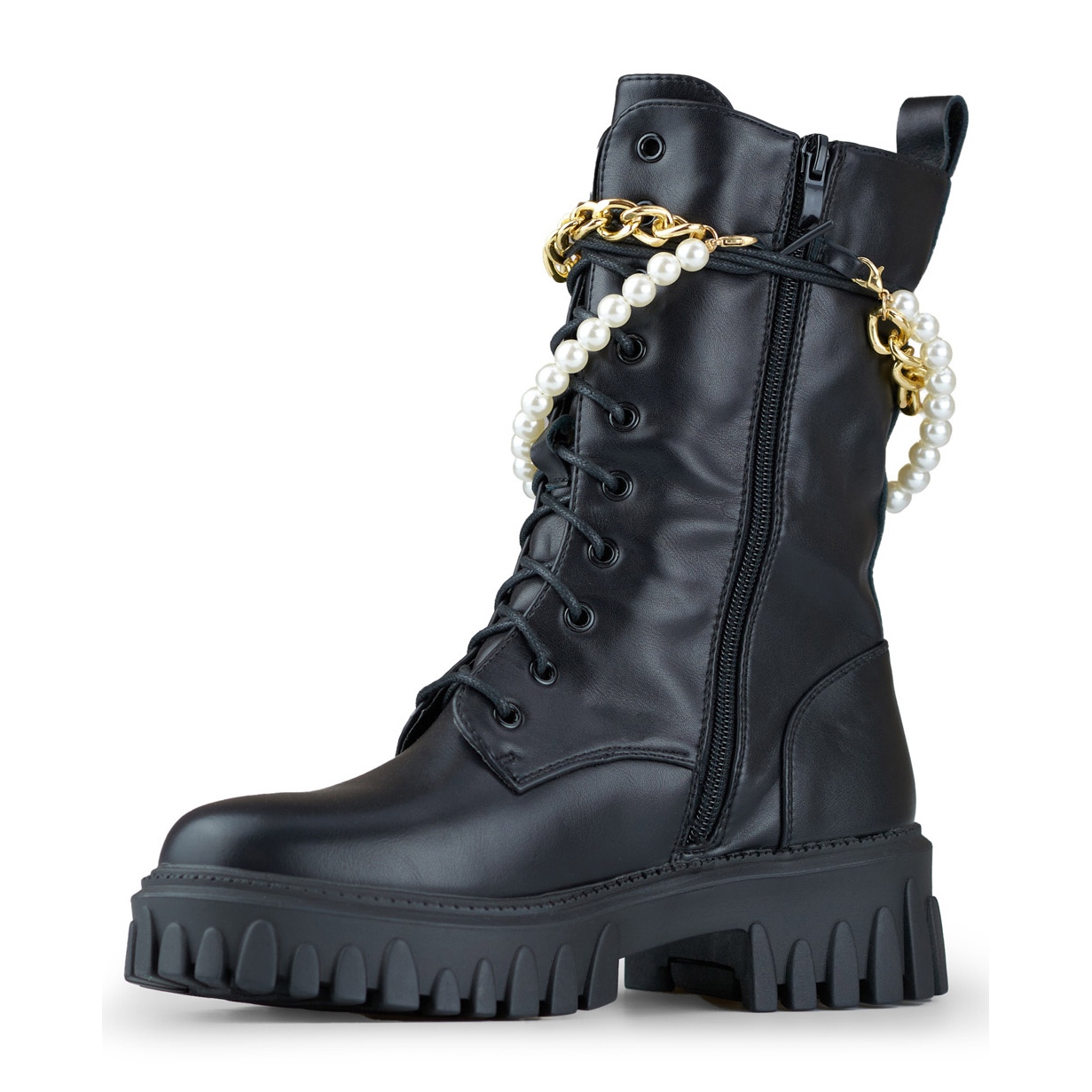 Trabalhadores negros modernos e atemporais feitos de couro ecológico. A combinação de caráter de rocha (strass, cadeia) com soluções práticas - o castelo e o laço garantem um ajuste rápido e perfeito, e a decoração destacável oferece a oportunidade de mudar rapidamente a aparência. O interior isolado faz com que os sapatos funcionem durante a temporada de outono/inverno.