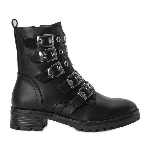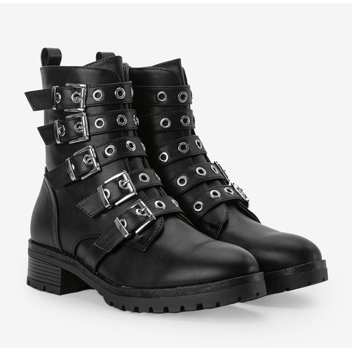 Os trabalhadores com fivelas Black Suzan são a escolha perfeita para mulheres que desejam combinar conforto com um estilo rock distinto. Estas botas de salto baixo distinguem-se não só pelo seu aspecto moderno, mas também pelo seu acabamento cuidadoso em couro ecológico. As decorações em forma de cinco elegantes fivelas combinadas com detalhes prateados conferem ao calçado um carácter que certamente chamará a atenção.