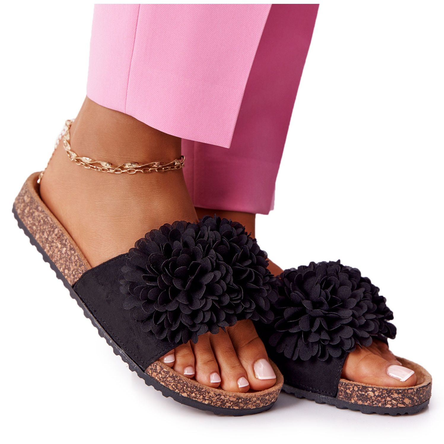 Os chinelos clássicos e elegantes femininos que funcionam nas estilizações do verão diário. A parte superior feita de couro ecológico parece elegante e macia, e o pompom decorativo acrescenta um sotaque sutil e elegante. A inserção perfilada garante a conveniência durante o uso mais longo, e uma plataforma estável com uma altura de 2,5 cm aumenta o conforto e molda ligeiramente a figura.