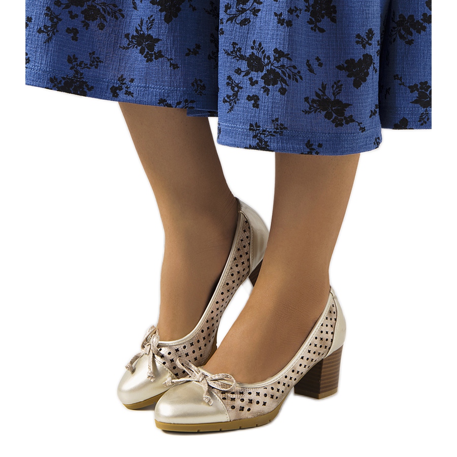 Descubra elegância e conforto em um - sapatos Pereira com detalhes dourados! Este modelo exclusivo alia design moderno e praticidade, sendo a escolha ideal para diversas ocasiões. Confeccionados em couro ecológico de alta qualidade na cor ouro claro, esses escarpins com certeza chamarão a atenção.