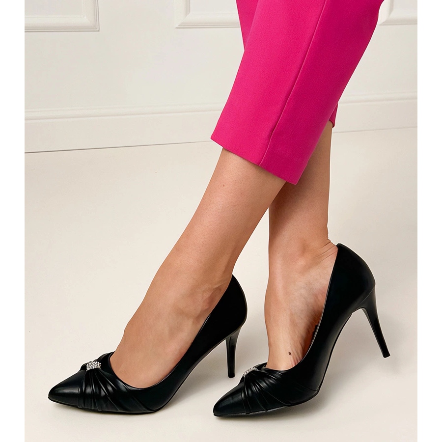 Detalhes: Bombas clássicas pretas em um alfinete com zircões preto