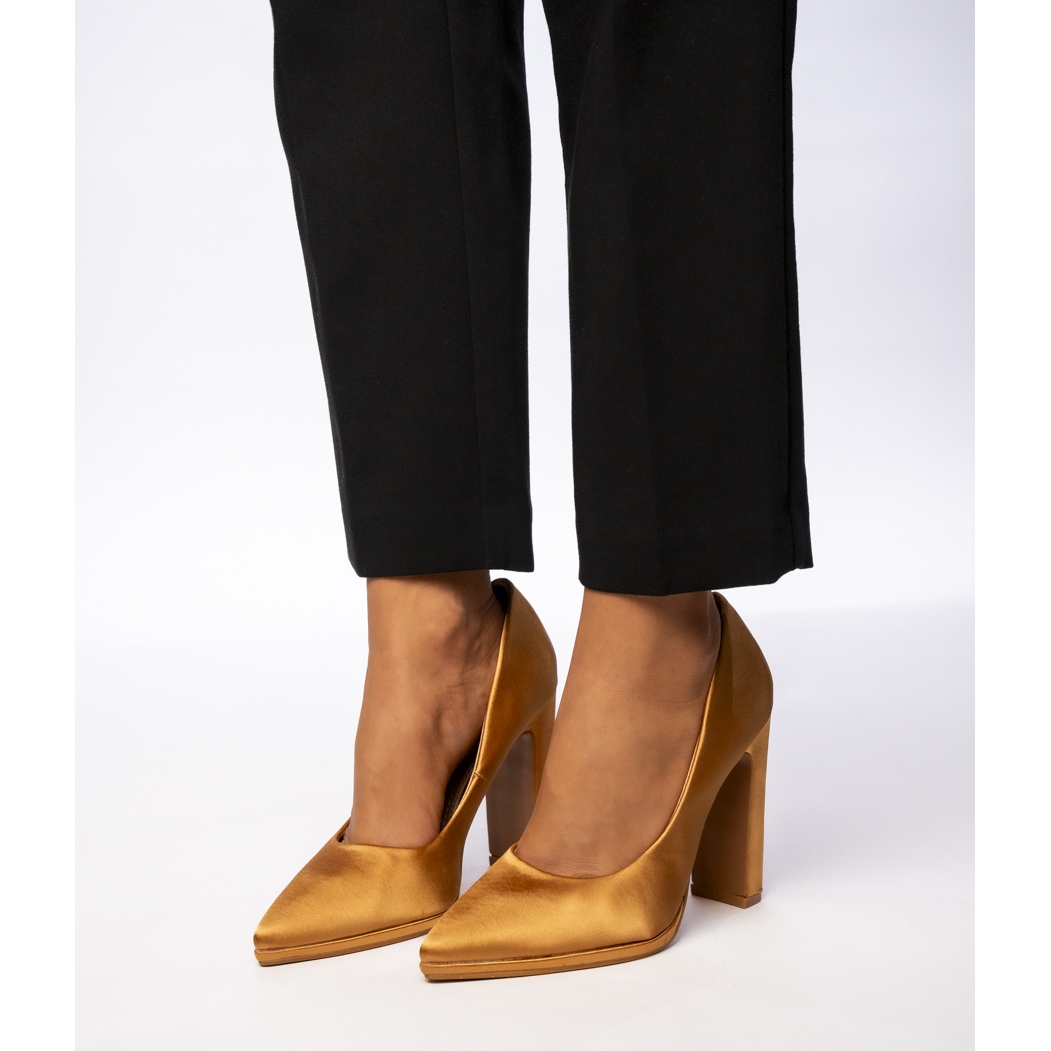 A sombra quente de camelo e o sutil acabamento acetinado dão a essas bombas um personagem único que chama a atenção e completa todas as criações elegantes. O post alto não apenas diminui a figura, mas também garante o conforto de usar o dia todo, o que os torna a escolha perfeita por longas horas no trabalho ou em festas.