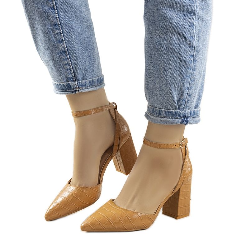 Estes são elegantes sapatos Davies de salto alto camelo que encantam com seu design moderno e cores exclusivas. Confeccionado em couro ecológico de alta qualidade, o cabedal caracteriza-se por uma estrutura estilosa que imita pele de crocodilo, o que lhe confere um caráter único. O modelo Davies possui uma tira entrelaçada no tornozelo, que além de conferir um visual chique, oferece suporte adicional.
