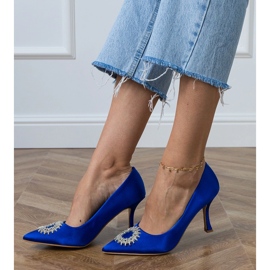 Feito de tecido de alta qualidade em um belo tom de Blu, as bombas emitem um estilo incomum. Sua superfície é decorada com strass deslumbrantes, que atraem aparência e adicionam o esplendor da sua estilização. A altura do calcanhar de 8,5 cm aumenta opticamente as pernas, garantindo o conforto de usar o dia todo.