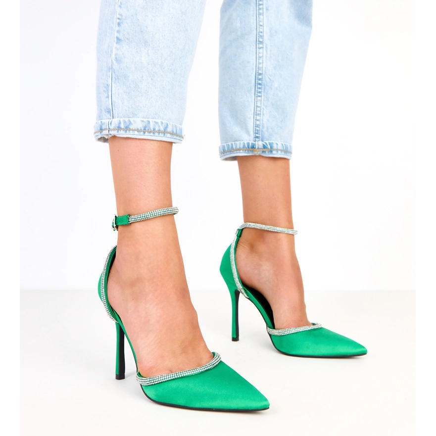 Inna marka Bombas de cetim verde com zircões presos com tornozelo Zizia