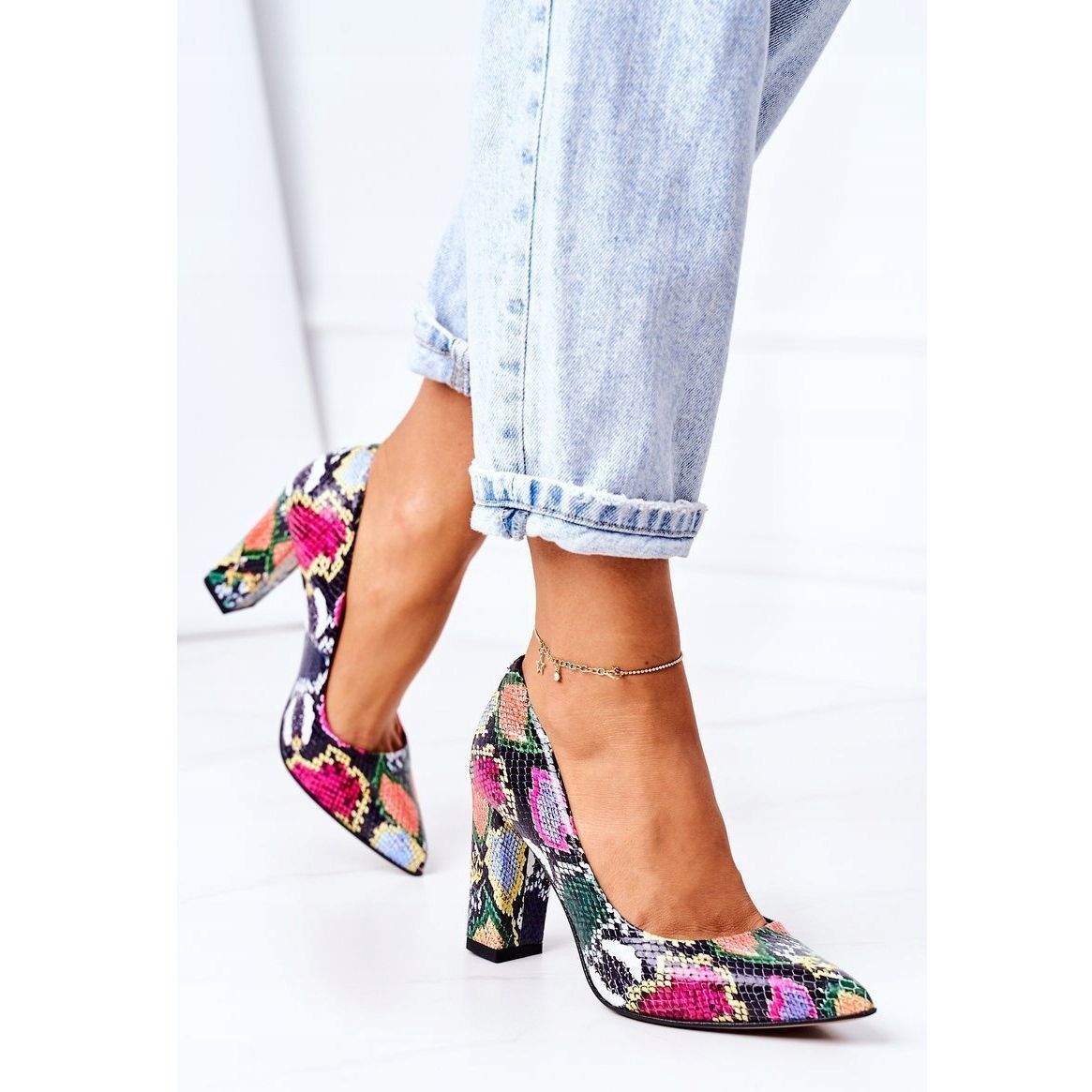 O modelo 2453 é caracterizado por um padrão de cobra multicolorido e moderno que adicionará elegância a qualquer estilo. A clássica biqueira amendoada e o salto bloco de 8,5 cm ajudam a alongar visualmente as pernas, garantindo estabilidade e conforto de uso.