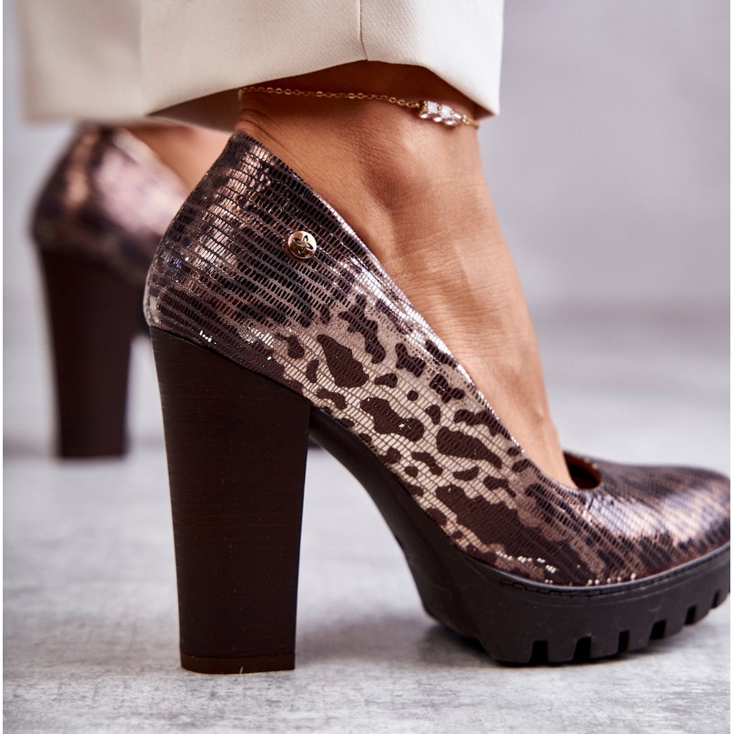 As elegantes bombas Maciejka, feitas à mão na Polônia a partir do couro natural da mais alta qualidade. O corte clássico com um dedo do pé de amêndoa e uma barra estável de 10,5 cm dá a figura de elegância sofisticada e, ao mesmo tempo, garante o conforto de uso graças à inserção suave e perfilada do couro natural. Um delicado motivo animal em tons de marrom acrescenta caráter e versatilidade - ideal para estilizações de escritório e noite.