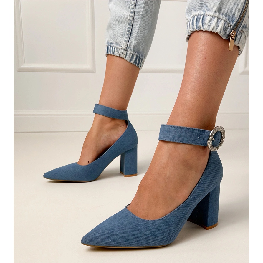 Detalhes: Bombas de jeans no poste com fivela e zircões azul