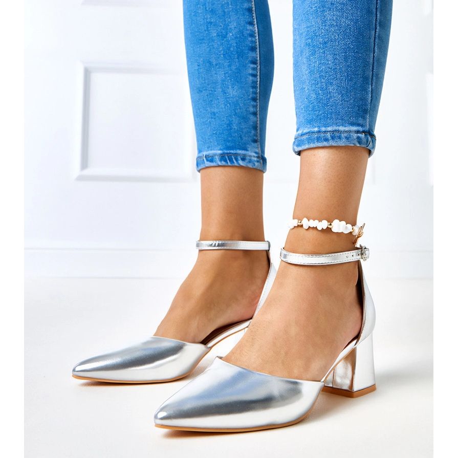 A cor prateada dará ao esplendor de qualquer estilização, e o nariz pontudo lhes dá um caráter muito feminino. Graças à altura do calcanhar de 6 cm, as bombas são perfeitas para ocasiões elegantes e para combinações diárias. A fixação para uma fivela ao redor do tornozelo garante estabilidade e enfatiza as pernas, e a sola de plástico marrom é elegante e prática.