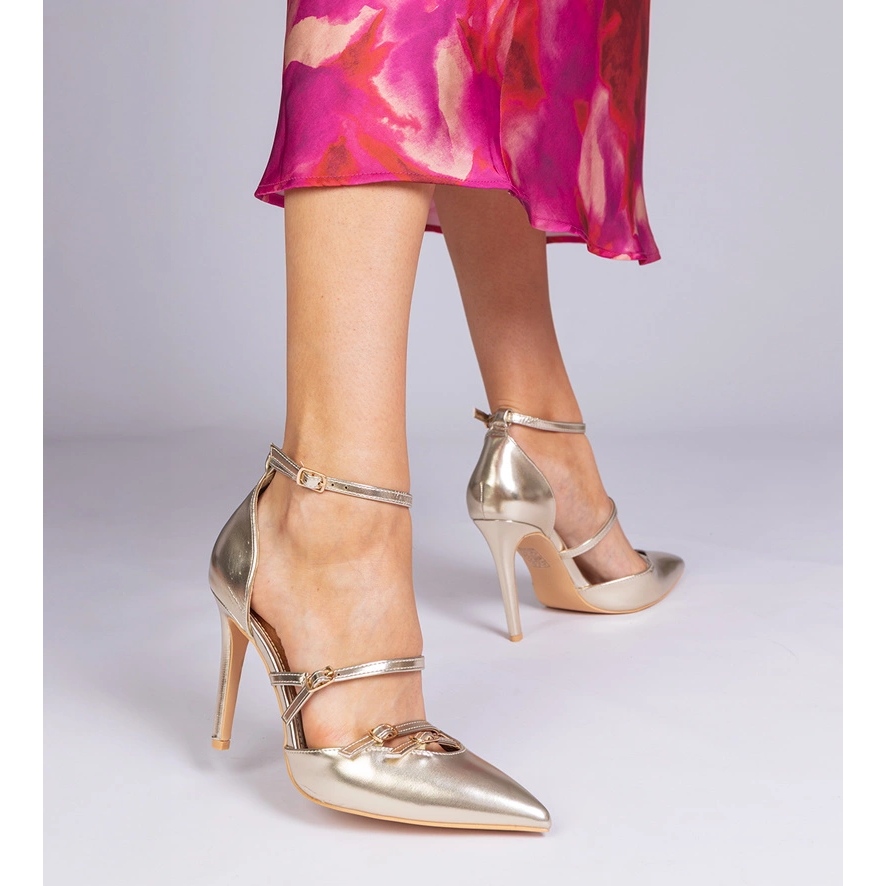 As bombas de ouro em um salto preso ao redor do tornozelo são uma ótima opção para mulheres que desejam trazer à tona elegância e confiança internas. O H10043 na cor de ouro impressiona com seu acabamento metálico, o que certamente chama a atenção do meio ambiente. O calcanhar alto com uma altura de 10,5 cm não apenas aumenta opticamente as pernas, mas também adiciona estilo a qualquer estilização.
