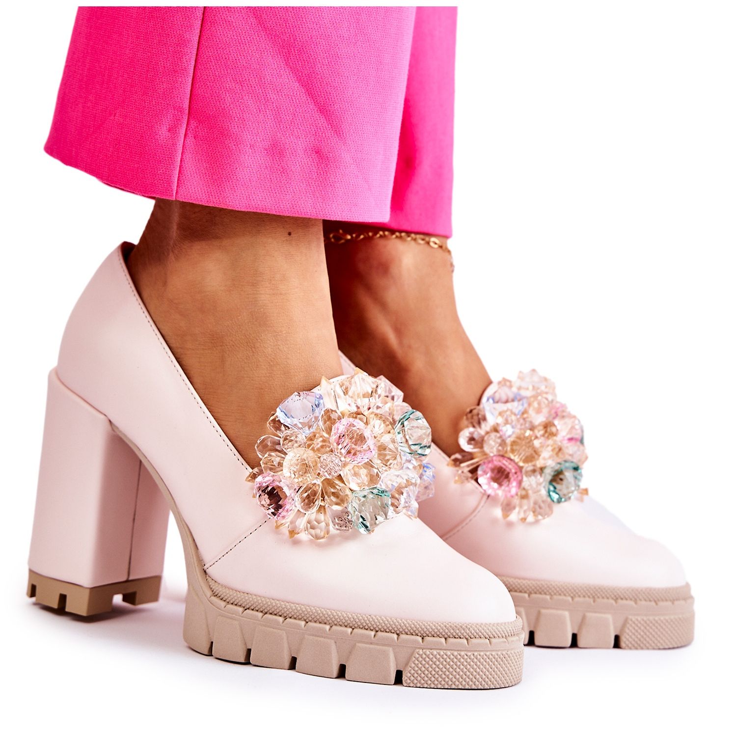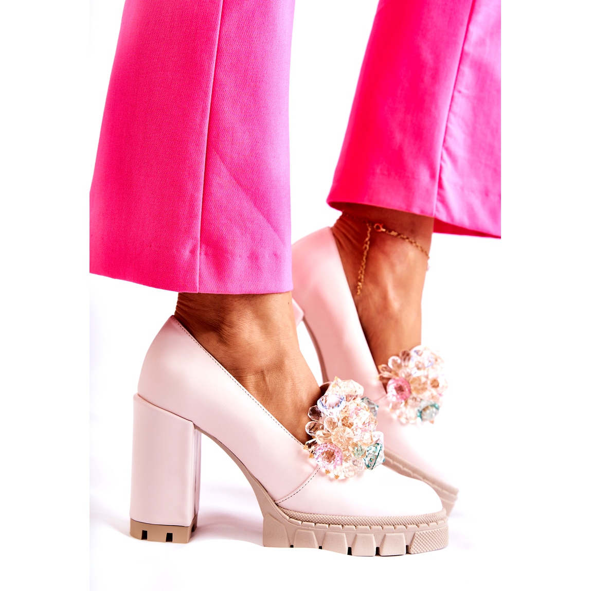 Bombas elegantes que combinam estilo feminino com conforto. O modelo Caterine é distinguido por um posto maciço e uma plataforma sutil (altura do calcanhar/plataforma 9 cm), o que dá estabilidade e conforto, mesmo em um salto mais alto. A sola do caçador melhora ainda mais a adesão, graças à qual você se sentirá confiante a cada passo.