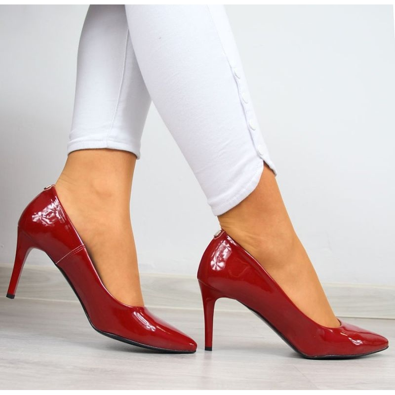Bombas clássicas em saltos altos juma em um espetacular acabamento vermelho envernizado. Ideal para estilizações noturnas, para ocasiões especiais e como um sotaque distinto em uma aparência de escritório. A combinação de soluções cortas e confortáveis das mulheres faz com que os sapatos pareçam extremamente chiques e, ao mesmo tempo, deitados confortavelmente na perna.