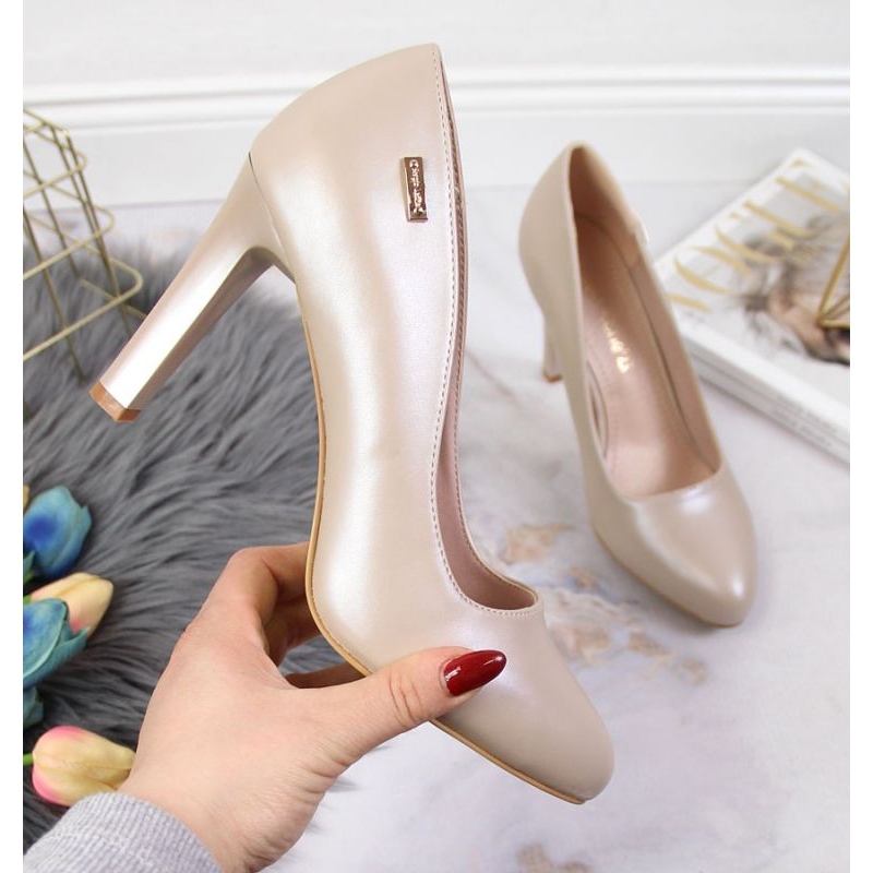 Bombas elegantes em um post estável, que combinam estilo e conforto diariamente e para ocasiões especiais. O modelo Sergio Leone na cor de pérola nude sk3ac funcionará em estilizações de escritório e noite.