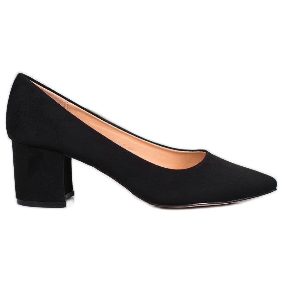 Os scarpins possuem salto bloco estável de 6 cm de altura, o que os torna extremamente confortáveis, mesmo em longas caminhadas. Feitos em couro ecológico com acabamento em camurça, esses sapatos combinam elegância com uma abordagem ecologicamente correta. A ponta pontiaguda confere-lhes um caráter moderno e o fecho deslizante torna-os extremamente fáceis de colocar e tirar.