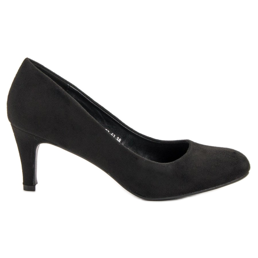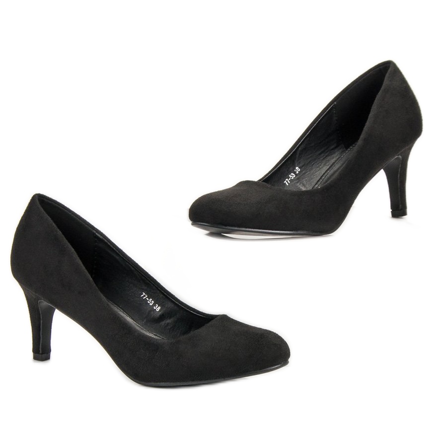 Confeccionados em couro camurça ecológico de alta qualidade, esses escarpins são caracterizados por uma cor preta profunda que agrega classe e elegância. O conforto de uso é garantido por um material macio e um calcanhar reforçado e embutido que estabiliza o pé. A altura do salto é de 7 cm, o que torna o calçado mais fino e ao mesmo tempo confortável o suficiente para ser usado por muito tempo.