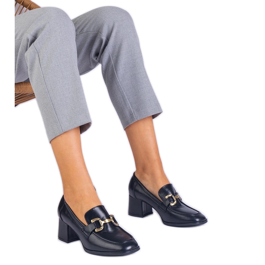 A altura do calcanhar de 5,5 cm e um post sólido tornam os sapatos perfeitos para saídas diárias e ocasiões especiais. O nariz redondo lhes dá sutilezas, e o fecho de inserção prático permite que você coloque rapidamente e decole rapidamente. Uma vantagem adicional é uma decoração metálica espetacular na forma de uma cadeia, que introduz um pouco de brilho e caráter.