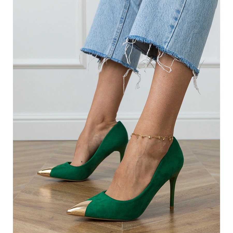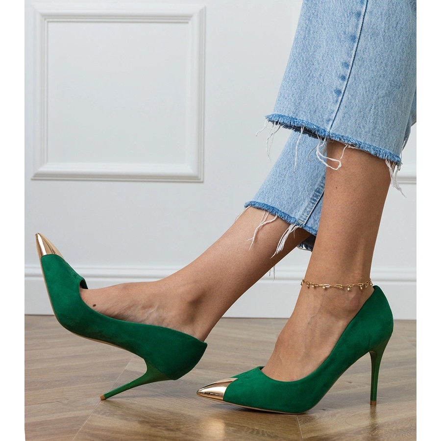 A cor verde, inspirada nas últimas tendências, animará qualquer estilização e a sola de plástico marrom garante durabilidade e estabilidade. O fixador de deslizamento permite a colocação rápida e fácil, o que torna essas bombas não apenas elegantes, mas também práticas.