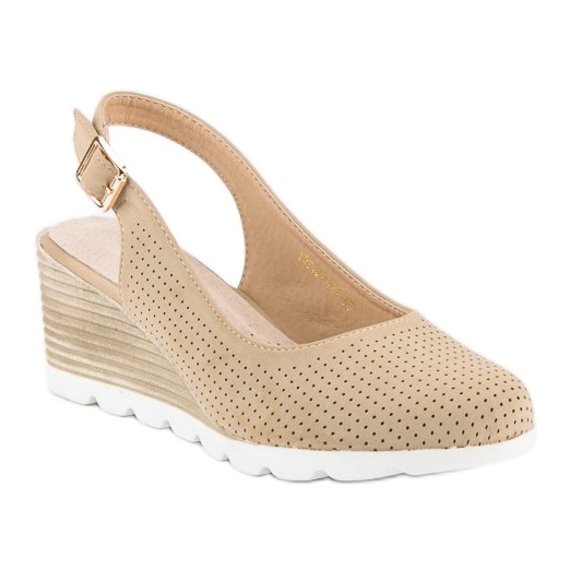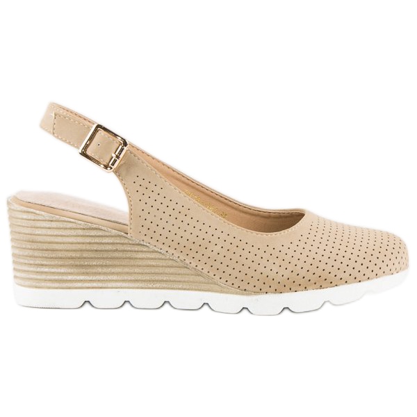 O interior dos scarpins é forrado em couro natural, o que torna cada passo agradável e confortável. O design vazado acrescenta leveza e elegância, e o nariz redondo os torna confortáveis, mesmo quando usados por longos períodos de tempo. Uma vantagem adicional é a cunha de 6,5 cm de altura, que molda perfeitamente a figura sem abrir mão do conforto.