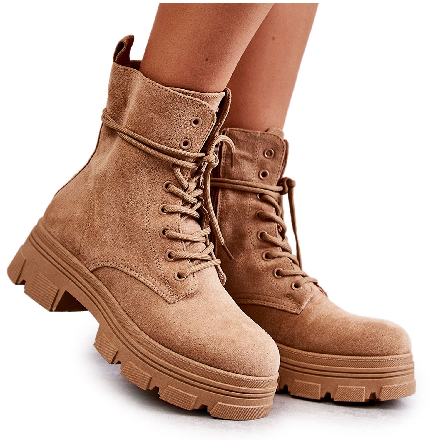 Confeccionadas em camurça ecológica agradável ao toque, as botas oferecem não só aparência estética, mas também conforto. Este modelo está equipado com um prático fecho e cordão, o que facilita a colocação e o ajuste ao pé. A sola de borracha antiderrapante garante estabilidade em diversas superfícies, e o salto plano de 5,5 cm garante conforto mesmo quando usado por longos períodos de tempo.