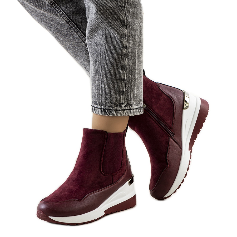 Descubra elegância e conforto extraordinários com botins de cunha Arkala cor de vinho. Estes sapatos únicos não só se adaptam perfeitamente às tendências atuais, mas também garantem conforto de uso graças ao ligeiro isolamento no interior. Feitos em camurça ecológica, têm um visual extremamente estiloso e sua biqueira redonda acrescenta um charme sutil.