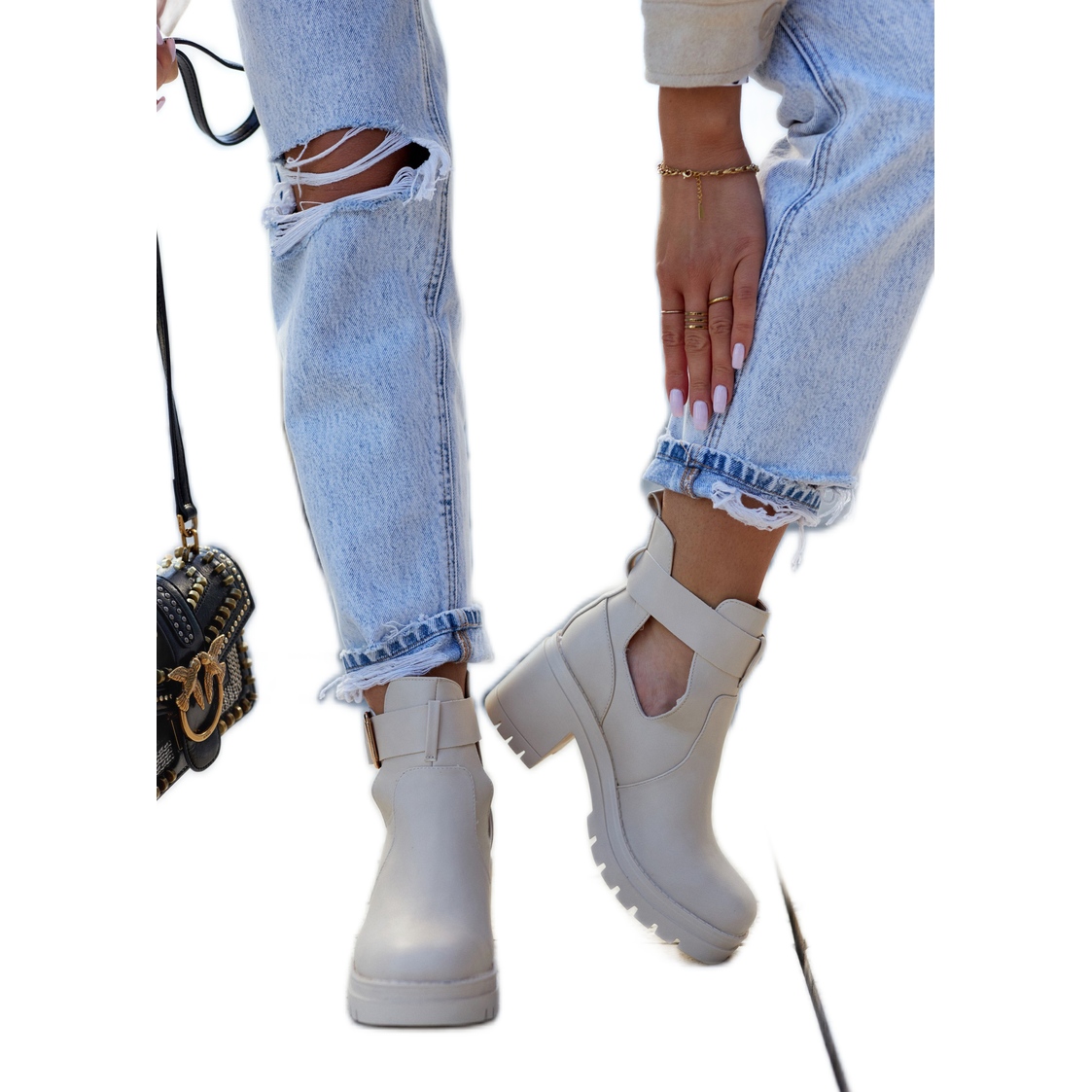 Detalhes: FE1 Bota de couro com cinto recortado bege Rosanne