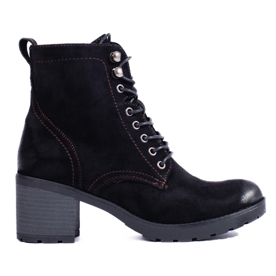 Botas femininas elegantes e confortáveis de W. Potocki, feitas de camurça ecológica em uma cor preta clássica. O modelo do tornozelo com um tolo de construção e rígido construído, isolado com uma inserção de cobertor de calçados - a escolha perfeita para a temporada de outono/inverno. A combinação de laço e zíper garante suposição fácil e ajuste preciso.