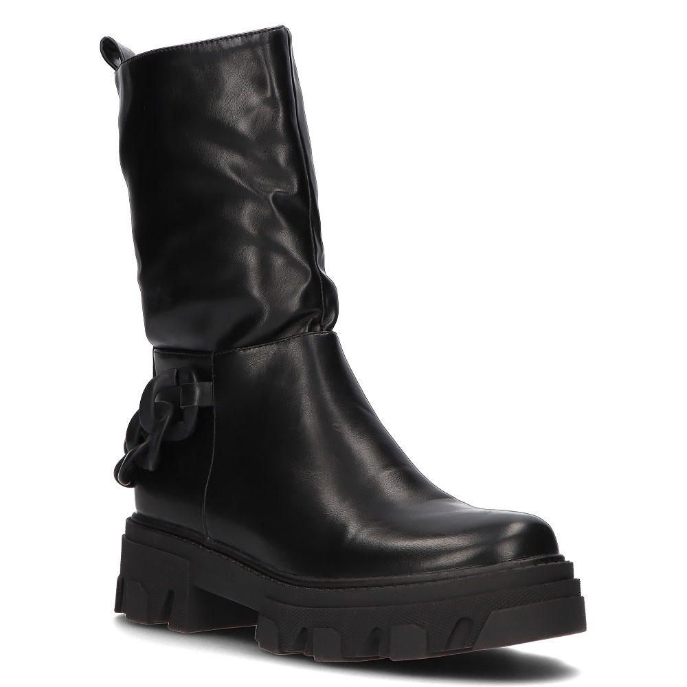 Estas botas são também uma óptima opção para mulheres que gostam de acessórios, pois o seu design elegante é enriquecido por uma corrente subtil, que lhes confere um carácter único. Sem estampa na clássica cor preta, eles combinam com vários estilos - do casual ao mais elegante.