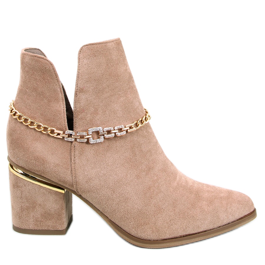 Este modelo impressiona pelos recortes modernos e pela atraente corrente decorada com pedras brilhantes que lhe conferem um caráter único. Os dedos cônicos fazem o pé parecer fino e a coisa toda parece extremamente feminina e elegante. Graças à textura suave aliada à camurça ecológica, estes botins enquadram-se perfeitamente nas tendências da próxima estação.