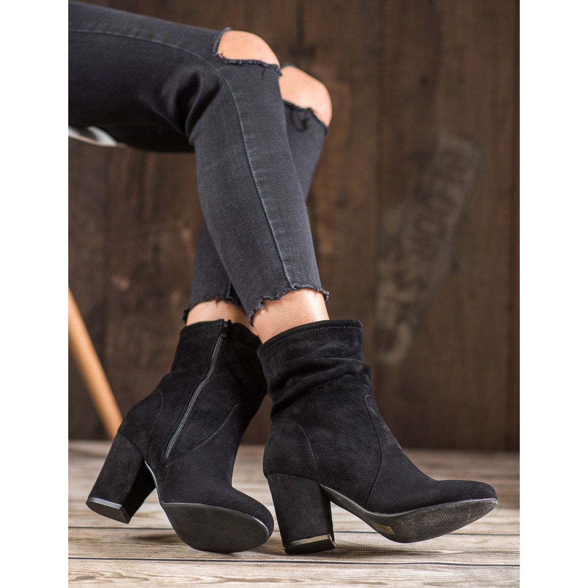 Confeccionados em couro camurça ecológico, os botins não só ficam lindos, mas também são ecologicamente corretos. O seu prático fecho permite colocar e tirar rapidamente, tornando-os na escolha ideal para o uso diário. O salto bloco estável com 8,5 cm de altura garante conforto mesmo durante o uso prolongado, e a sola de plástico lisa garante boa aderência.
