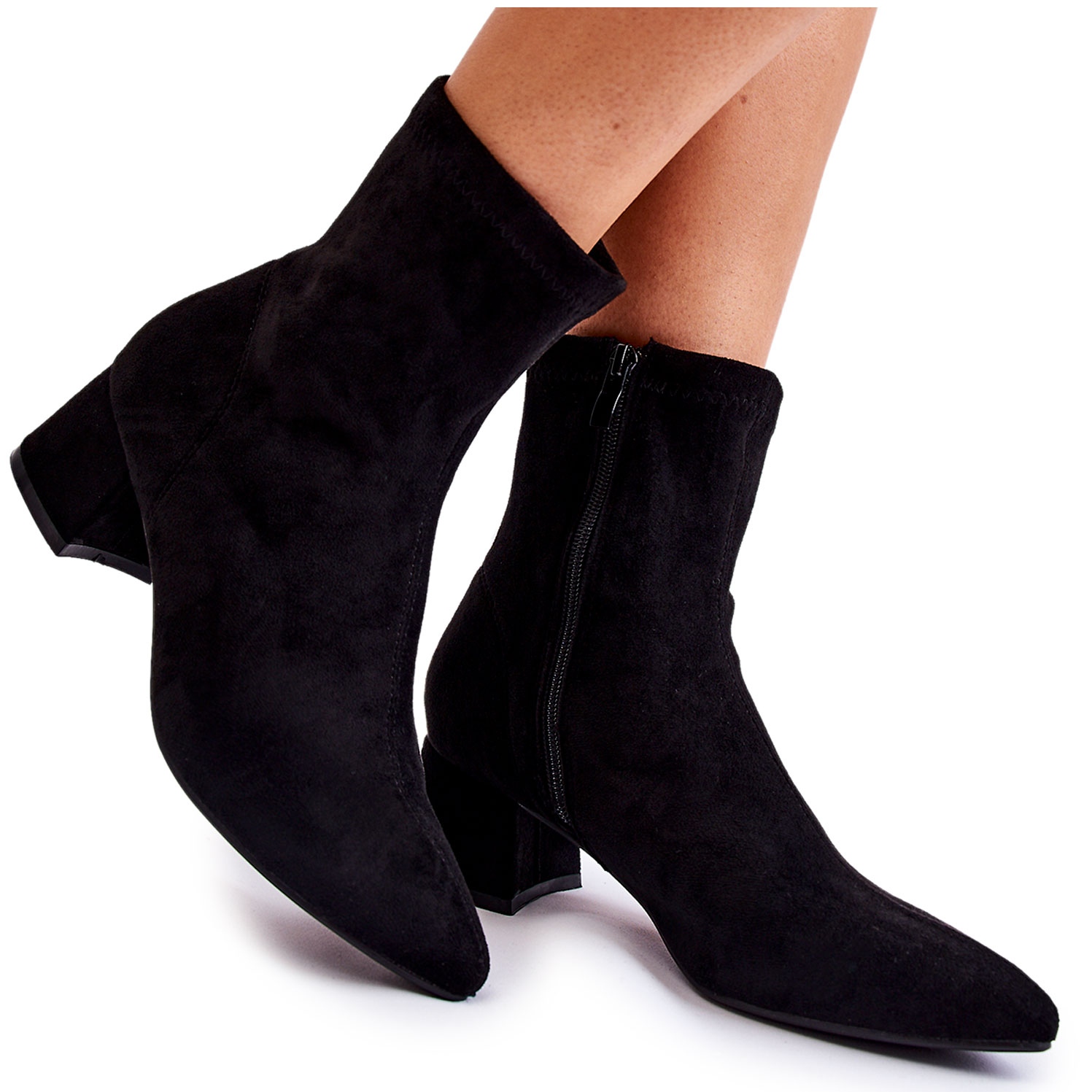 Estas botas têm um salto estável em forma de bloco, com 5,5 cm de altura, o que realça ainda mais o seu carácter elegante. A ponta pontuda confere leveza e elegância, e a clássica cor preta faz com que combinem com vários estilos.