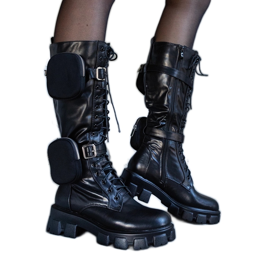As elegantes botas de turfa pretas combinam uma aparência elegante e enorme com soluções práticas. Feito de couro ecológico de alta qualidade, com uma sola grossa e recaída e dedo redondo. Um elemento característico é um cinto decorativo com uma fivela e uma saqueta pequena - ideal para chaves ou itens pequenos. Botas amarradas na frente nos cadarços, até que o lado seja preso com um zíper para facilitar a colocação. O interior isolado oferece conforto nos dias mais frios.