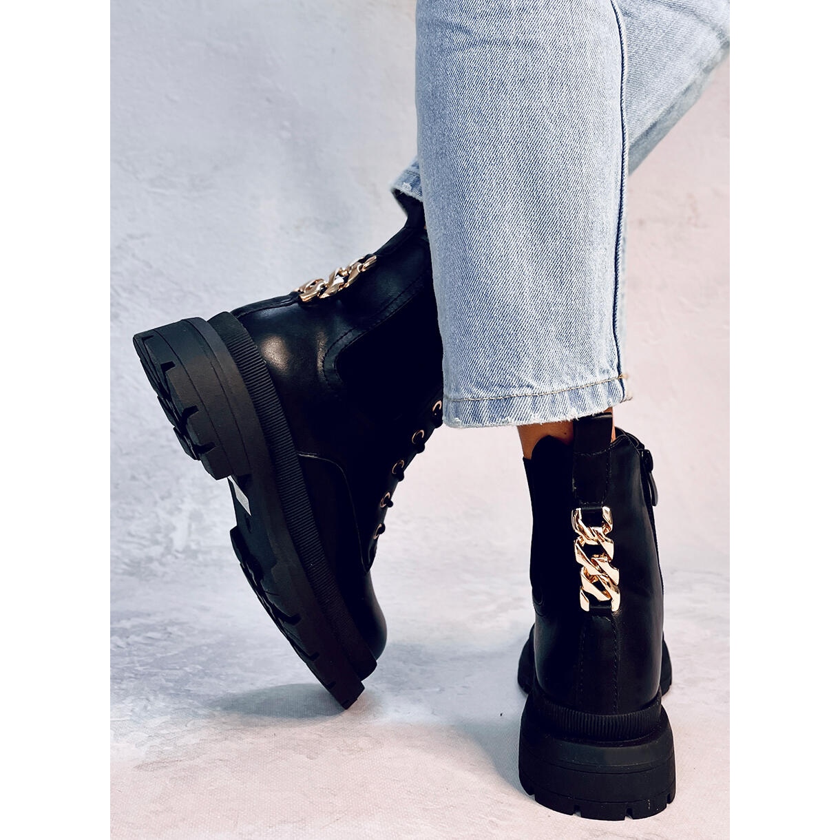 Botas pretas desajeitadas - pretas, atadas com uma corrente decorativa