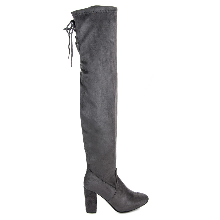 Apresentamos elegantes botas de salto alto com atacadores da marca Juliet, que certamente se tornarão um elemento indispensável no seu guarda-roupa. Confeccionadas em couro camurça ecológico de alta qualidade, essas botas cinza combinam um corte clássico com um estilo moderno.